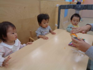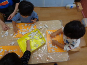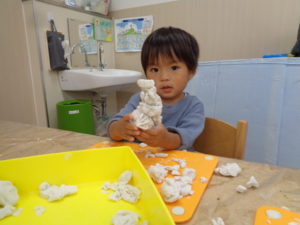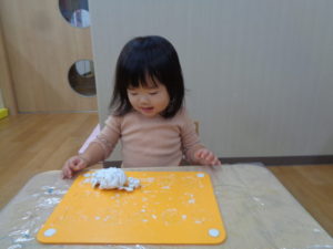 ちぎったり丸めたり、思い思いの形を作っていきます。ちぎった粘土を重ねて「ひこーき!」と言う子もいました。粘土を様々なものに見立てて遊べるようになってきました。