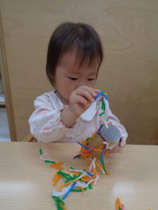 両面テープの紙を上手に剥がし、その上に毛糸を貼っていきました。指先を使って、とても真剣に取り組んでいます。どんな