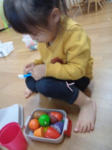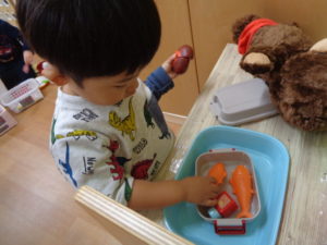 ままごとが大人気!今日から新しいお弁当箱が登場し、お弁当作りに大忙しでした。作ったお弁当を持ってどこにお出かけするのかな?