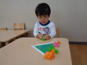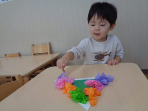 みかん組さんは、おはながみを使って制作しました。
