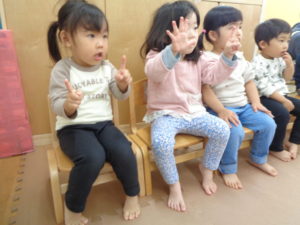 ジョー先生の歌に合わせて、指を使って数えたり、絵本を読んでくれたりして、