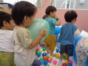 プールに入ってカラフルボールをつかんだり、風船でバレーをしたり、色々な遊び方を発見して楽しみます。
