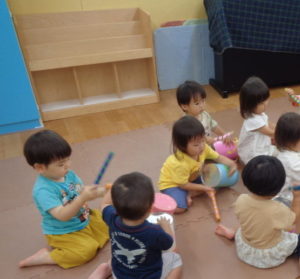 大きな太鼓、どぉん、どぉん、小さいな太鼓、とん、とん、とん、保育者と一緒に上手にリズムを合わすことが出来ました\(^_^)/