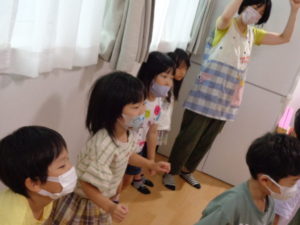 5歳児さんは、今日英語がありました。先生が登場すると、「ハロー」と元気に挨拶をする子どもたち。まずは、「しあわせならてをたたこう」の曲に合わせて体を動かしました。