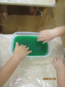 パフェを作ってみたり、1つの寒天で感触を楽しむ子、想像力豊かに遊ぶ子。時間いっぱい、楽しみました。