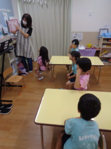その後は、「ようかいしりとり」の絵本を見ました。子どもたちは歌を覚えていて、みんなで歌いながら見ることを楽しみましたよ♪