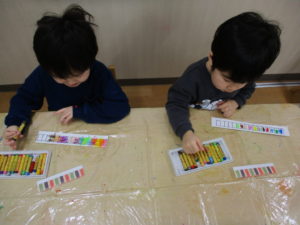 「どの色にしょうかな⁈」「これにしょう」などと、おしゃべりしながら、マス目ごとに色を塗っていきます🖊