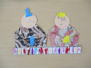 クレヨンでひな壇に色をつけたり、折り紙で折ったひな人形に扇や尺などを、のりづけしたりしました✨