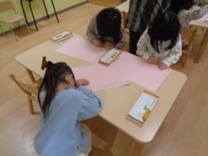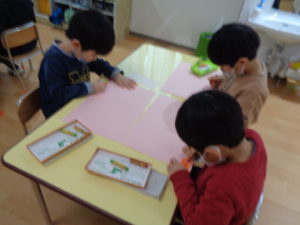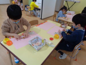 そんな今日のにじ組3,4歳児さんは制作をしました。3月に向けてひな人形を作りました。