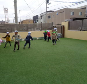 制作の後は、園庭であそびました。ふたば組さんと一緒にしっぽ取りをして遊びました。4歳児さんは走るスピードが年少さんやふたば組さんよりも速いので、ハンデを付けました。ギャロップ・ケンケン・ジャンプなどで追いかけたり逃げたりしました。