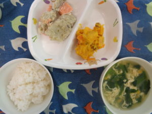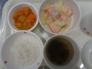 ・ご飯・鮭のポテトバター焼き・ほうれん草の卵スープ・かぼちゃサラダでした。