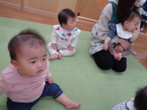 みかん組のお部屋に移動してのリトミック。場所が違うから緊張した子や、きょとんとしとしている子、ニコニコの子色々な初めての表情を見せてくれましたよ☺