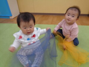 お名前を呼んでもらったり、ちゅうりっぷや、ちょうちょの曲に合わせて布をひらひら~♬