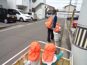 歩いて行くお友だちと、散歩車に乗って行くお友だち、