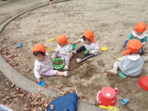 砂場では、スコップで砂をすくって、上手にバケツやアイスカップなど