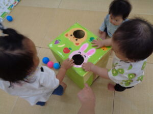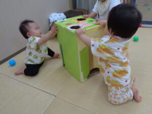 ボールを入れてみる子や、箱につかまり立ってカタカタみたいに押し進める子どもなど様々な遊び方をして楽しんでいました。