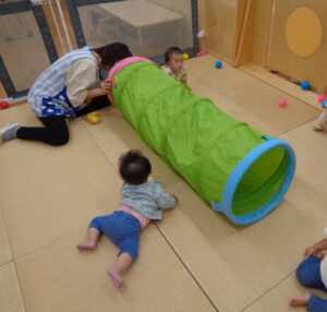 トンネルの入り口で立ち止まって見たり、中に入ってハイハイをしたりして、楽しんでいましたよ。