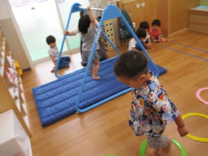 元気いっぱいのふたばぐみさんは、お部屋で運動遊びをしました。