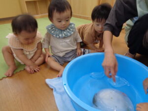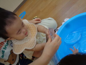 「びっくりしたね~」「つめたくて気持ちがいいね~」と保育者が声をかけると、