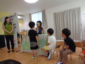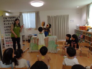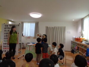 今日は、にじ組さんで防犯のお話を高松南警察署の方々が人形を使って子どもたちに分かりやすく教えてくださいました。準備をしている様子を見て興味津々の子ども達。どんな話が始まるのかとワクワクしていました。