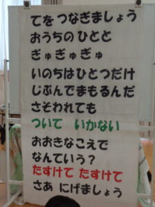 最後に手をたたきましょうの替え歌を歌って防犯のお話は終わりました。みんな楽しんでお勉強ができました。また、おうちでも話を聞いてみて下さいね☆