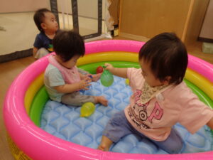 プール遊びの予定でしたが、外のあまりの暑さのため、室内でビニールプールの中で水風船あそびをしました🎈