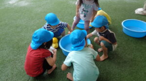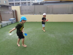 タライの中に水を入れると、手や足にかけては水の感触や水鉄砲に水を入れては友だちとの撃ち合いを楽しんでいました。