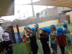 そんな子ども達の気持ちが通じたのか、水遊びの時間には雨もやみ、予定通りに水遊びを開始!