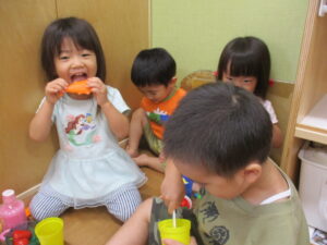 今日ふたばぐみさんはお部屋で大好きなおままごと遊びをしました。