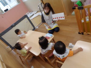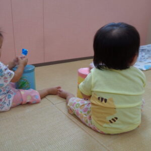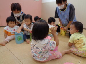 音楽をかけて、手作り楽器で遊びましたよ♪音楽が大好きなもも組さんは、ゆらゆらと身体を揺らしたり、「手をたたきましょう」の手遊びでは、パチパチとをたたいたり、足踏みしたり可愛い姿を沢山見せてくれて、とっても癒されました♡