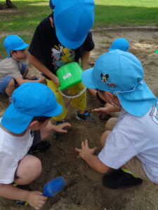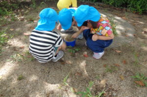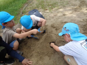 「水持ってきたよ!」「もうすぐつながるかも!」と、山づくりに夢中な年長さん。友だちと協力して大きい山を作っていました。年中さん年少さんは、虫を捕まえて「これ、おうち!!」と、バケツに葉っぱを入れて虫のお家を作っていました。それぞれのあそびを楽しんだ後は保育園に帰って給食を食べました。