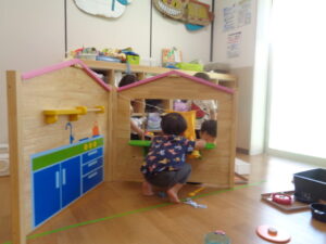 おままごともお友だちどうしの関わりが出てきました。「どうぞ」「ありがとう」「かして」「いいよ」色々なことができるようになってきたね。