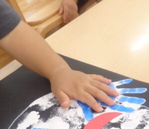 タンポに絵の具をつけて画用紙にペタン!楽しいね♡じっくり取り組めるようになってきましたね。