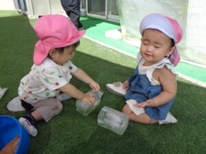 少しでも涼しく過ごそうと思い、園庭で氷遊びをしました!!