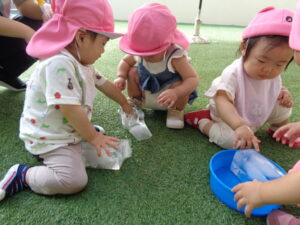 氷をもち上げたり、指先でツンツンしてみたりとみんなそれぞれに氷の冷たい感触を楽しんでいました。