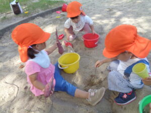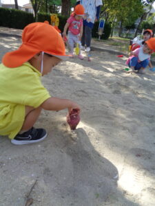 砂場にさつまいもを埋めて、さつまいも堀りごっこをしました🍠