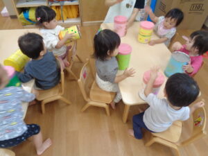 一人に一つずつ太鼓を配ってあげたら、底をパンパン!と思いきり叩いて喜んでいる子、お友だちの叩いている様子をみて真似をしている子、どんな音がでるのかな?と不思議そうに見ている子と様々ですが曲に合わせて、思い思いに楽しんでいましたよ。
