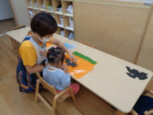 制作では、ハロウィンの日に着る予定の衣装に、シールなどを