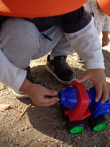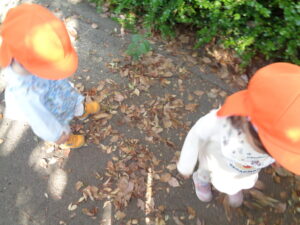 道端や、公園で「葉っぱカサカサ、パリパリだね~」と言いながら保育者が足で落ち葉を踏み音を楽しんでいると、「バリバリ!」と言って真似る子もいました。