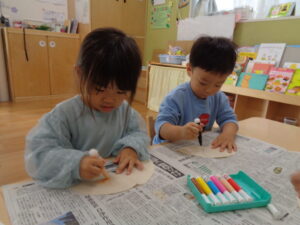 「ねずみだよ」などお友だちや保育者にたくさんお話ししながら絵を描く子、一言も話さず集中してコーヒーフィルターいっぱいに絵を描く子、製作はみんなの個性がでますね😊