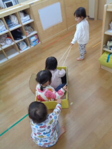 あおむしさんの乗り物にお友だちを乗せて引っ張るお友だち。二人三人と乗っていくと、、重くてひっぱれない💦
