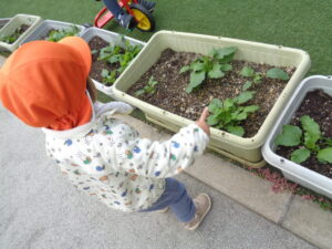 にじ組さんの栽培しているかぶやブロッコリーの野菜のなえに興味深々のみかんぐみさん。