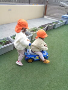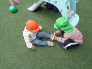 そのあとは、園庭でふたば組さんやもも組さんと遊びましたよ。