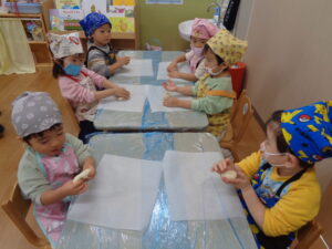 年中さん・年少さん・ふたば組さんは出来上がった生地を