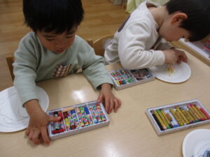 紙皿にクレヨンでかきかき🖍色を選ぶのも、かくのも真剣です。