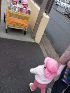 さて、今日のもも組さんは、雨がやんでいる時を狙って、周辺散歩に行きました。