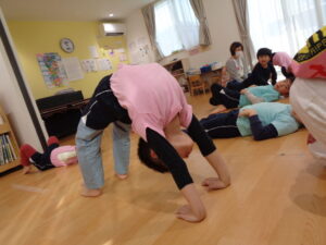 次に柔軟運動でよく身体を動かした後に、ブリッジをしました。