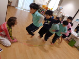 長縄では“グ~グ~ケンケン♪”の練習をしてから一生懸命に長縄を跳んでいました!