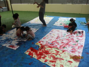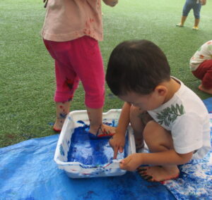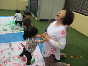 手に絵の具をたっぷり付けて、足、お腹、