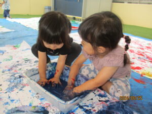 絵の具の感触を楽しみながら、思い思いの色で、子どもたちの描いた世界がどんどん紙に広がっていきます。